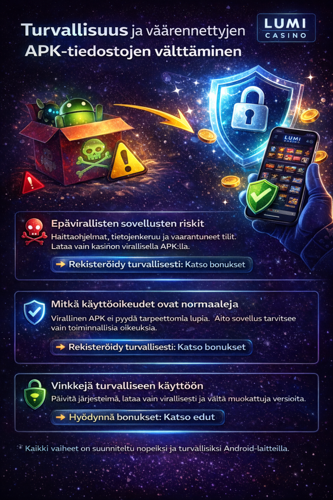 Lumi Casino -sovellus tulee asentaa ainoastaan kasinon viralliselta verkkosivustolta. Epäviralliset APK-tiedostot, joita jaetaan kolmansien osapuolten sivustoilla, foorumeilla tai viestisovelluksissa, voivat sisältää haittaohjelmia, tietojenkeruuta tai muokattuja toimintoja. Tällaiset sovellukset voivat vaarantaa käyttäjätilin, henkilökohtaiset tiedot ja talletetut varat. Turvallisen pelikokemuksen varmistamiseksi suositellaan aina virallisen lähteen käyttöä.